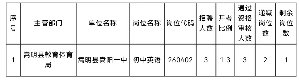 根据《昆明市嵩明县教育体育局2026年专项人才引进公告》有关规定,经网络报名后,因报名人数未达到开考比例,1个引进岗位予以递减,具体情况如下: