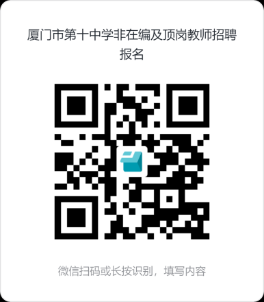 3.线上提交资料:有意者在规定时间内将《厦门市第十中学招聘非在编及顶岗教师报名表》(见附件)并附上相关证书材料(身份证、毕业证书、学位证书、教师资格证书、其他可证明自己工作能力和业绩材料等)电子文档及证书扫描件成一个PDF文件,文件以“应聘岗位+姓名”命名。