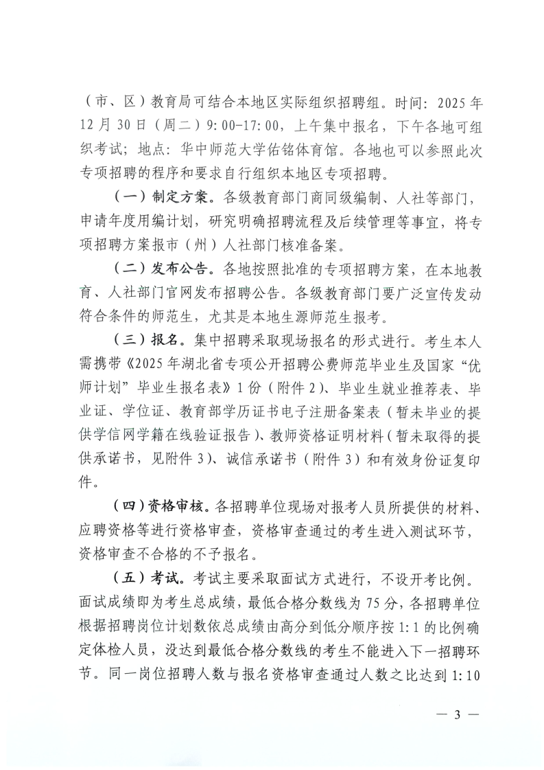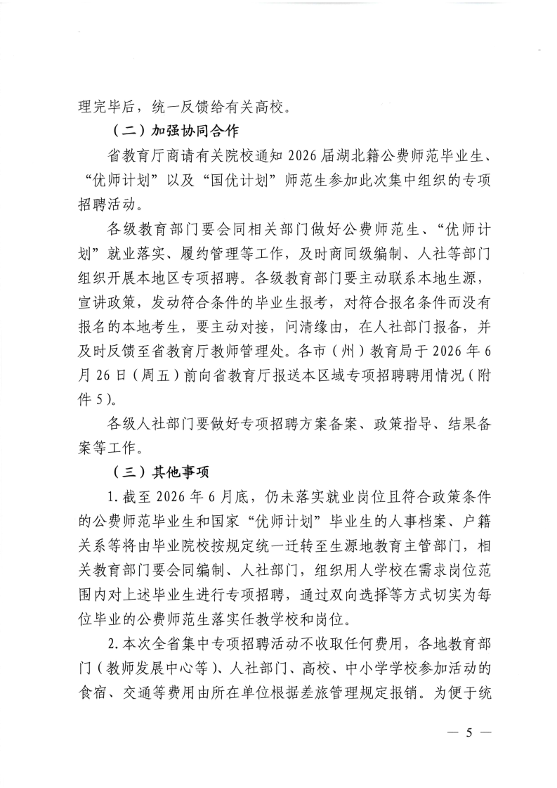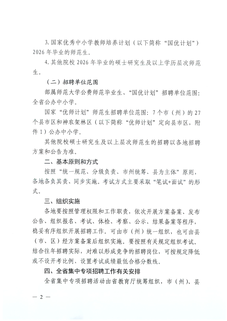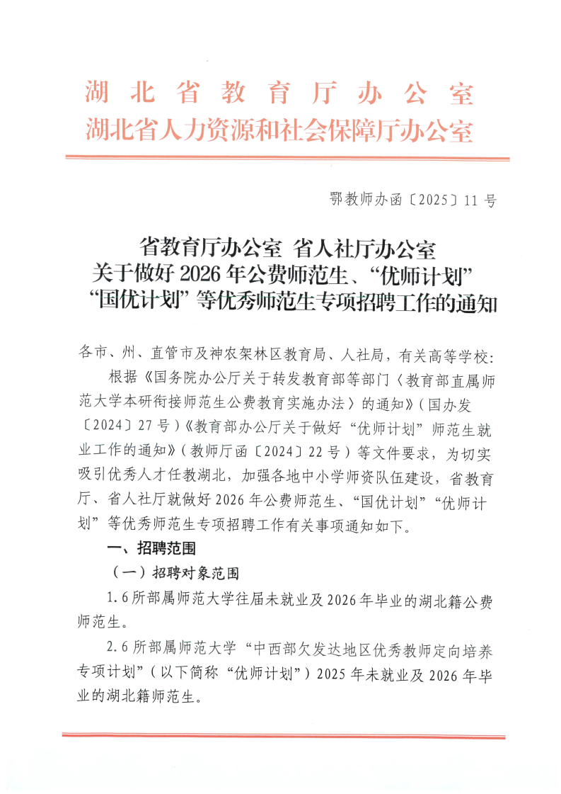 2026年湖北省公费师范生、“优师计划”国优计划”等优秀师范生专项招聘工作的通知(若干人)