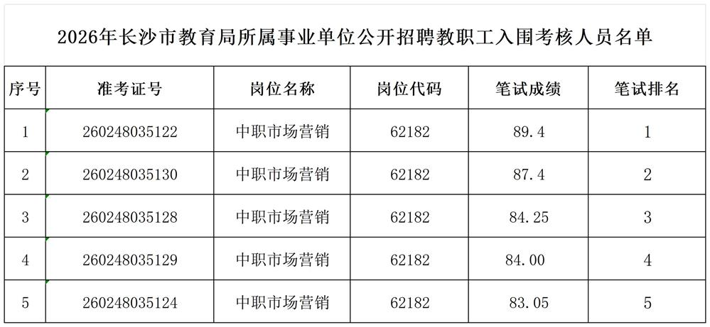 2026年长沙市教育局所属事业单位公开招聘教职工笔试、笔试成绩复核、确认考核岗位、资格初审工作已经完成。根据《2026年长沙市教育局所属事业单位公开招聘教职工公告》的规定,现将入围考核人员名单(共5人,见附件)予以公布。