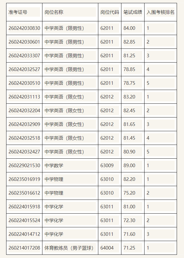 2026年长沙市教育局所属事业单位公开招聘教职工笔试、笔试成绩复核、确认考核岗位、资格初审工作已经完成。根据《2026年长沙市教育局所属事业单位公开招聘教职工公告》的规定,现将入围考核人员名单(共17人,见附件)予以公布。